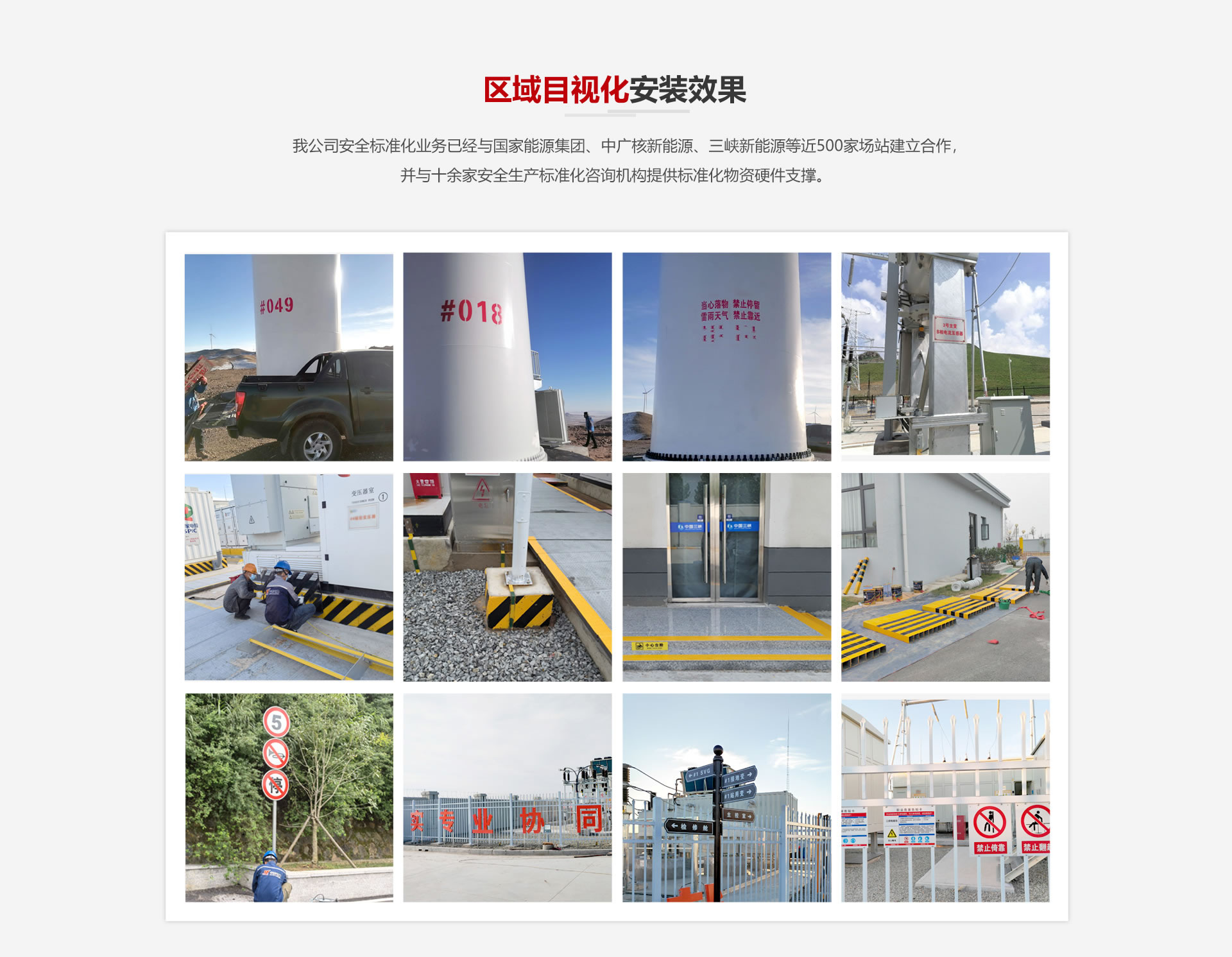 我公司安全標準化業(yè)務已經(jīng)與國家能源集團、中廣核新能源、三峽新能源等近500家場站建立合作,并與十余家安全生產標準化咨詢機構提供標準化物資硬件支撐。