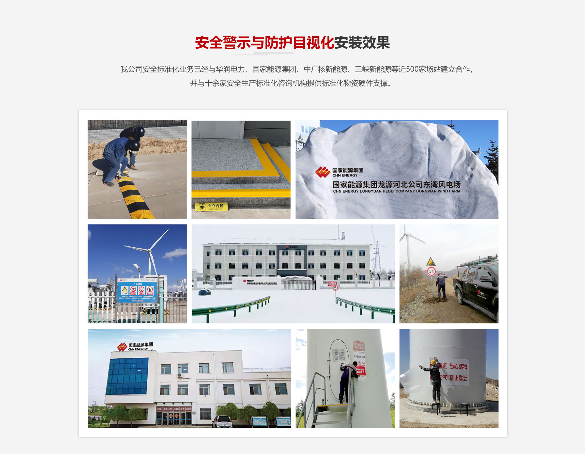 我公司安全標(biāo)準(zhǔn)化業(yè)務(wù)已經(jīng)與國(guó)家能源集團(tuán)、中廣核新能源、三峽新能源等近500家場(chǎng)站建立合作,并與十余家安全生產(chǎn)標(biāo)準(zhǔn)化咨詢機(jī)構(gòu)提供標(biāo)準(zhǔn)化物資硬件支撐。