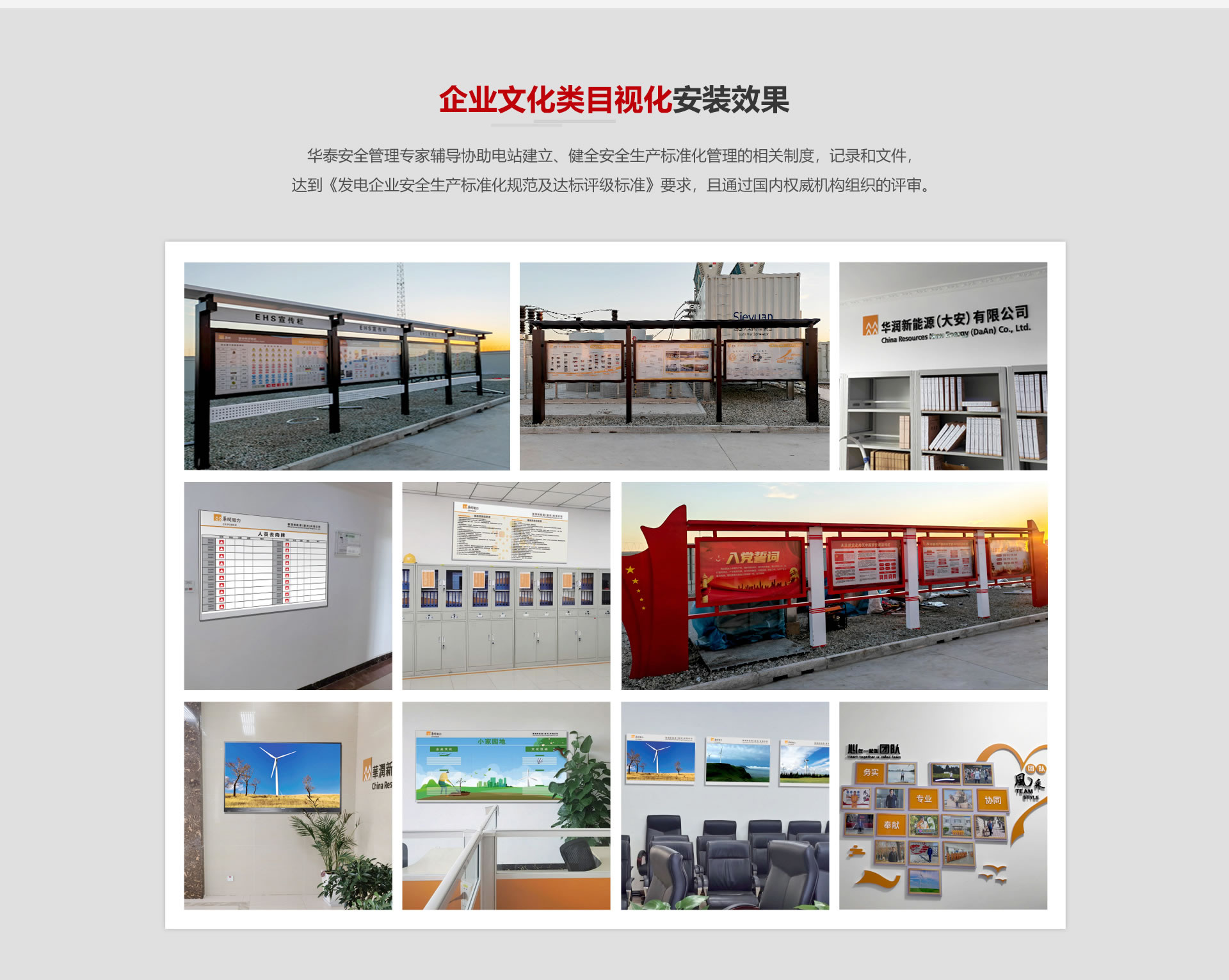 我公司安全標準化業(yè)務已經(jīng)與國家能源集團、中廣核新能源、三峽新能源等近500家場站建立合作,并與十余家安全生產(chǎn)標準化咨詢機構提供標準化物資硬件支撐。